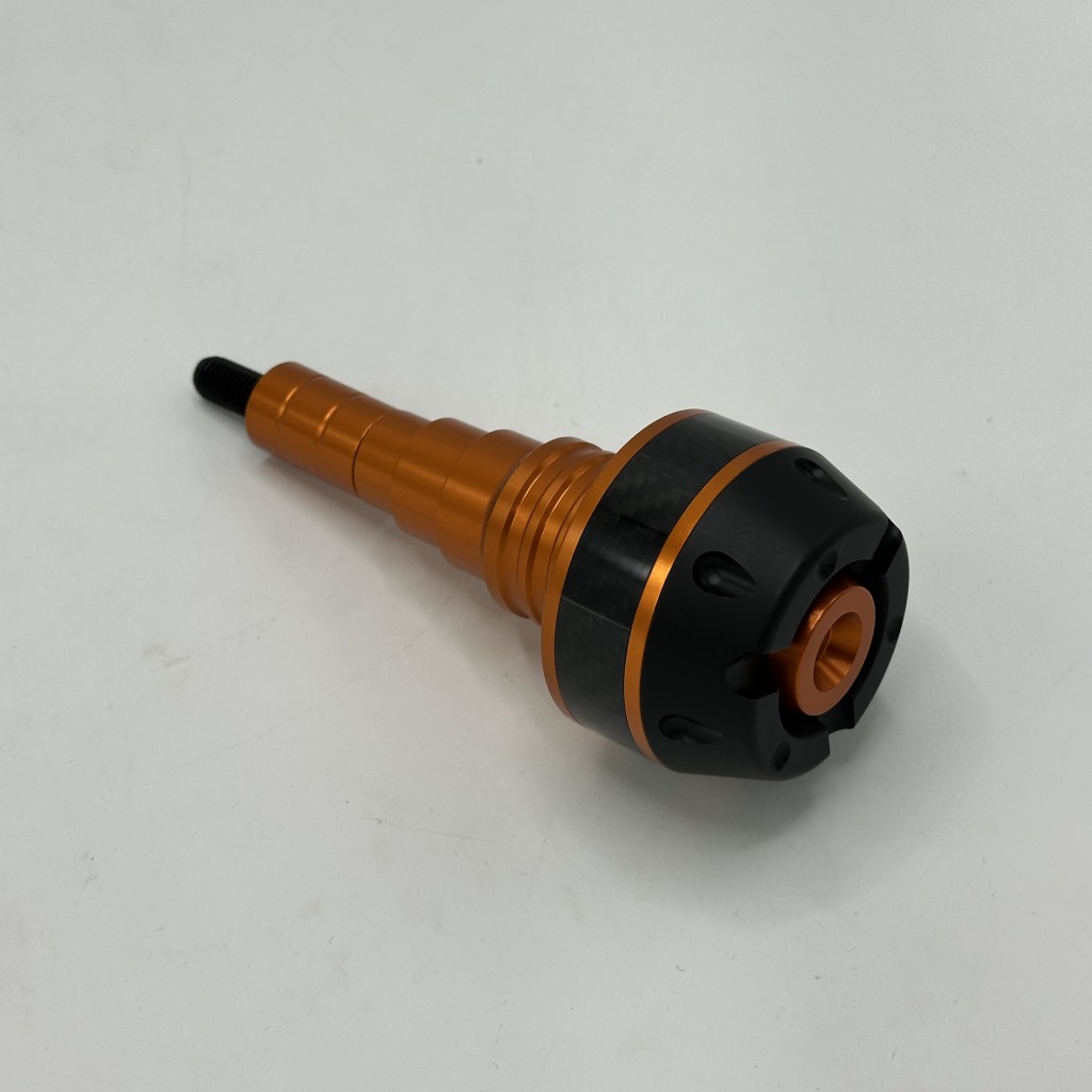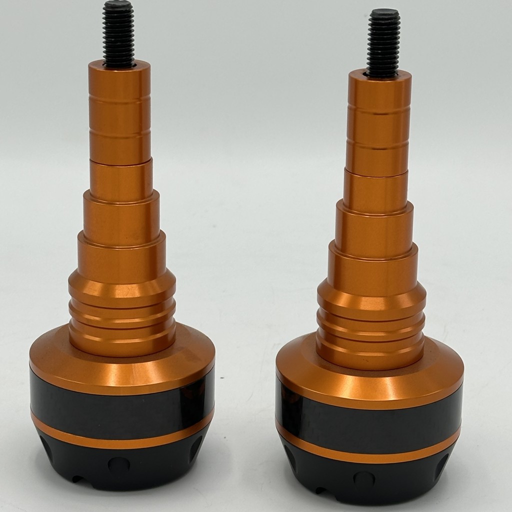 بدنه اصلی از آلیاژ آلومینیوم CNC با رنگ های مختلف آنودایز شده ساخته شده که هم مقاومت بالایی در برابر ضربه دارد و هم ظاهر اسپرت و جذابی به موتور میدهد. بخش پایینی از پلاستیک فشرده و مقاوم (Delrin/ABS) تشکیل شده که هنگام تماس با زمین ضربه را جذب کرده و مانع انتقال مستقیم فشار به شاسی و بدنه موتور میشود. طراحی چندپلهای و مخروطی شکل آن باعث توزیع بهتر نیرو و کاهش سایش در زمان سر خوردن روی زمین میشود.
